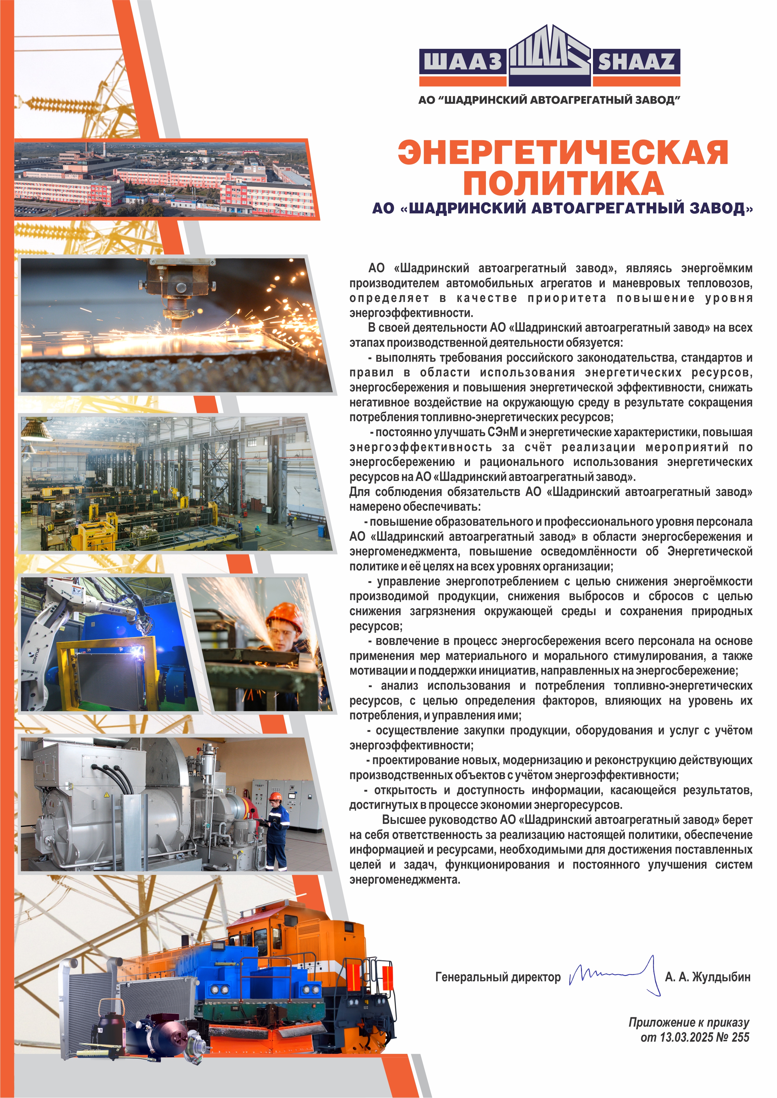 АО «Шадринский автоагрегатный завод», являясь энергоемким производителем автомобильных агрегатов и маневровых тепловозов, определяет в качестве приоритета повышение уровня энергоэффективности.